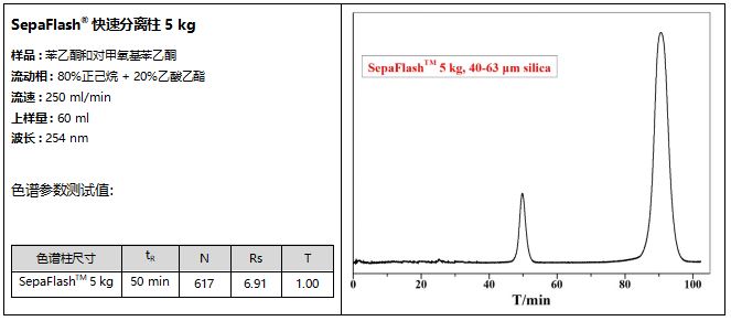 SepaFlash®快速分离柱系列喜添新成员,柱子尺寸为5kg。通过一次运行可分离500g样品;拥有和SepaFlash系列产品同样的重现性。5kg快速分离柱采用熔融技术焊接而成,工作压力可达100psi(6.9bar)。通用的Luer-Lok进出液口尺寸与成熟产品3kg分离柱一样;可以兼容各种快速液相制备系统。